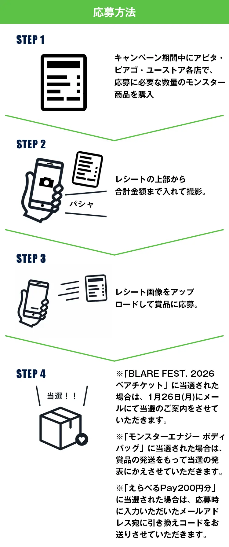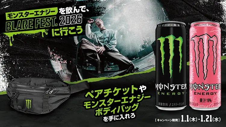 ※日本標準時応募規約モンスターエナジージャパン合同会社(以下、「モンスターエナジー」といいます。)が運営する「モンスターエナジーを飲んで、BLARE FEST. 2026に行こう」キャンペーン(以下、「本キャンペーン」といいます。)は、本応募規約の下、厳正に行われるものです。本キャンペーンをご利用頂くにあたっては、以下の応募規約をよくお読み頂き、本応募規約にご同意頂けない場合にはご応募をお控え下さい。応募者は、応募と同時に、本応募規約に同意したものとみなされます。