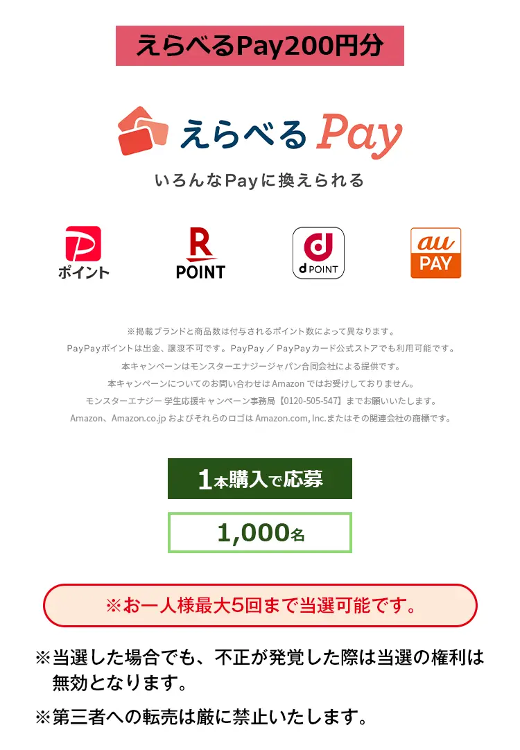 ・えらべるPay200円分1枚: 1本購入で応募 / 計1,000名当選