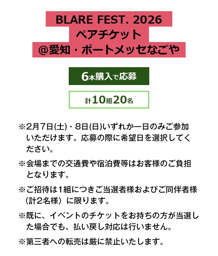 景品の応募条件/当選者数・BLARE FEST. 2026一日チケット2枚:6本購入で応募 / 10名当選 ※応募の際、2日間のイベント日程の中からご希望の日程1つを選択することができます