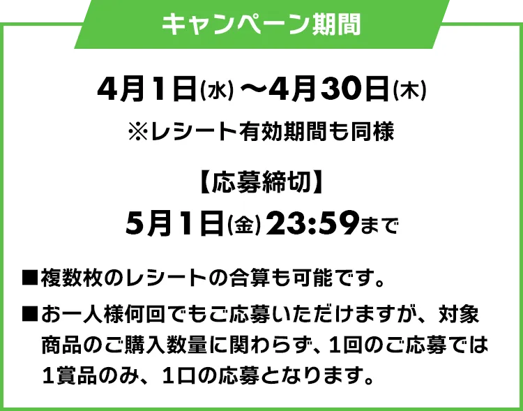・対象商品のご購入数量に関わらず、1回のご応募では1賞品のみ、1口の応募となります。