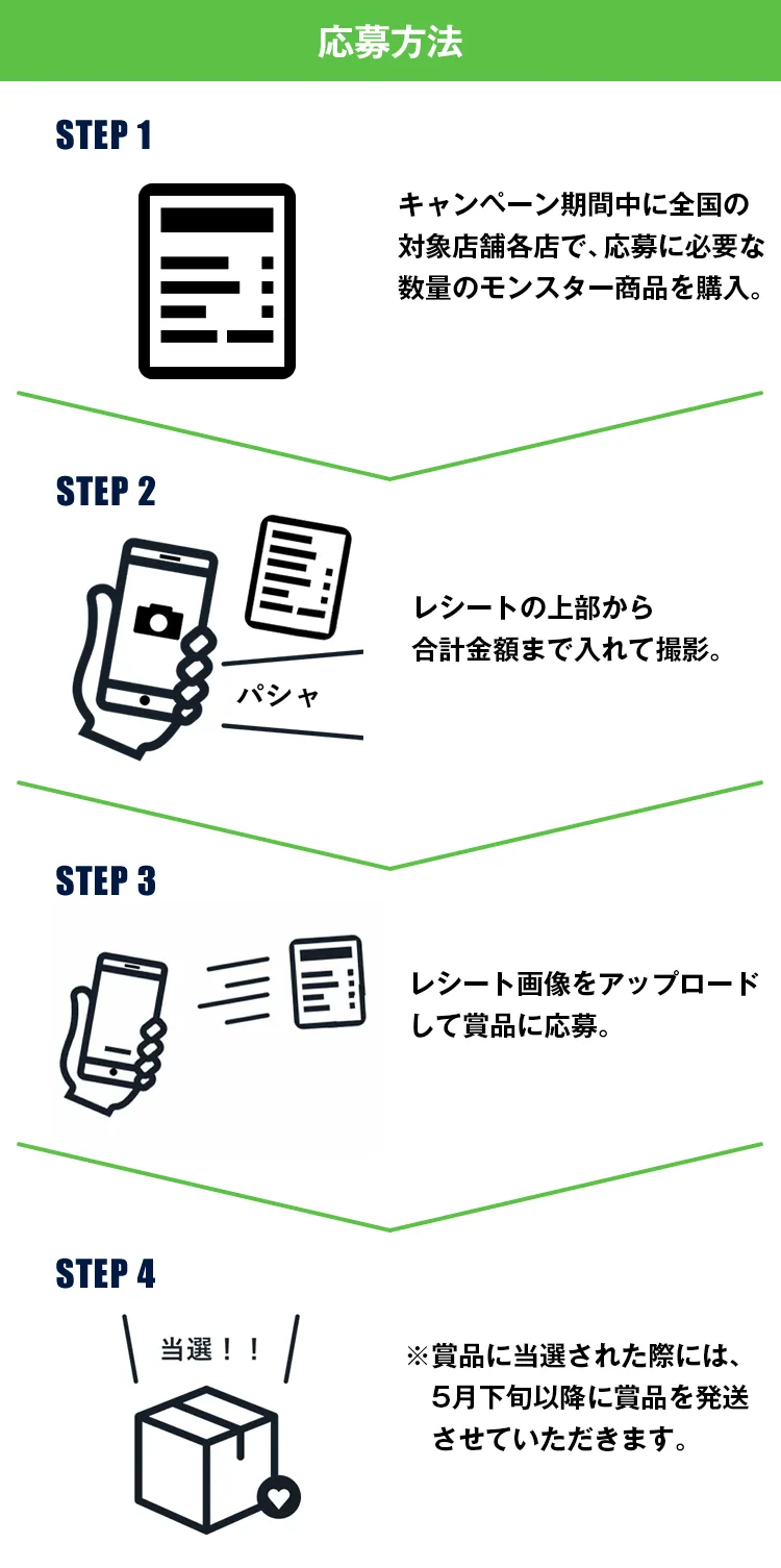・キャンペーン実施チェーン、アサヒ飲料(株)、モンスターエナジージャパンの従業員、および関係者の応募は受け付けない場合がございます。