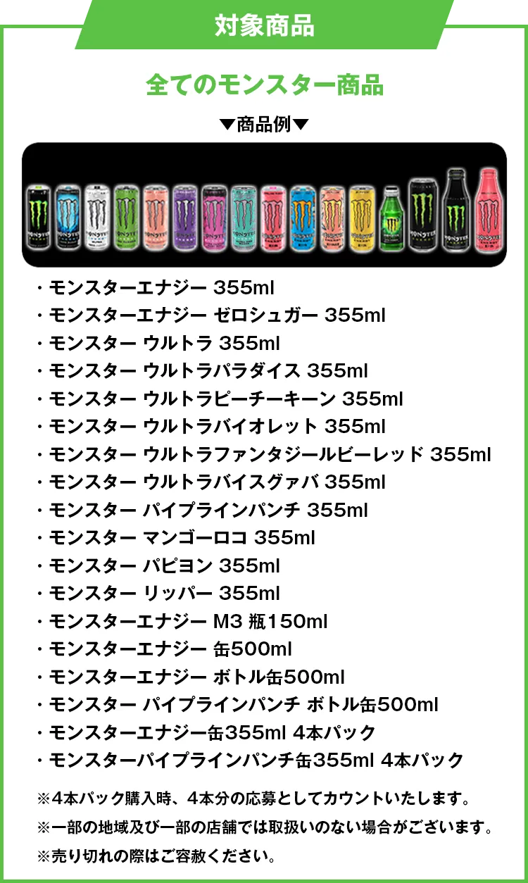 対象商品:モンスターエナジー、モンスターエナジー ゼロシュガー、モンスター ウルトラ、モンスター ウルトラパラダイス、モンスター ウルトラピーチーキーン、モンスター ウルトラバイオレット、モンスター ウルトラファンタジールビーレッド、モンスター ウルトラバイスグァバ、モンスター パイプラインパンチ、モンスター マンゴーロコ、モンスター パピヨン、モンスター リッパー、モンスターエナジー M3、モンスターエナジー 缶500ml、モンスターエナジー ボトル缶500ml、モンスター パイプラインパンチ ボトル缶500ml、モンスターエナジー缶355ml 4本パック、モンスターパイプラインパンチ缶355ml 4本パック