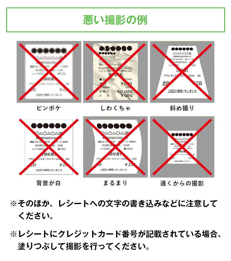 ・レシートにクレジットカード番号が記載されている場合、切り取るか塗りつぶして添付を行ってください。
