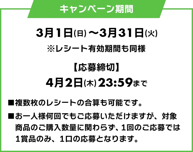 ・対象商品のご購入数量に関わらず、1回のご応募では1賞品のみ、1口の応募となります。