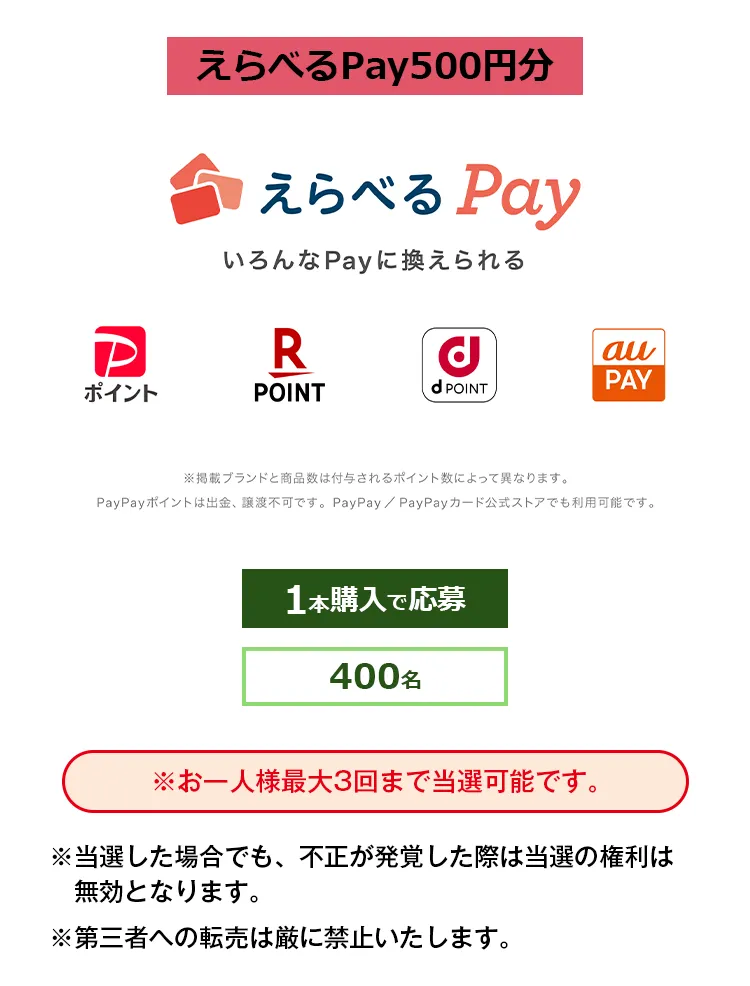 ・えらべるPay500円分1個: 1本購入で応募 / 400名当選