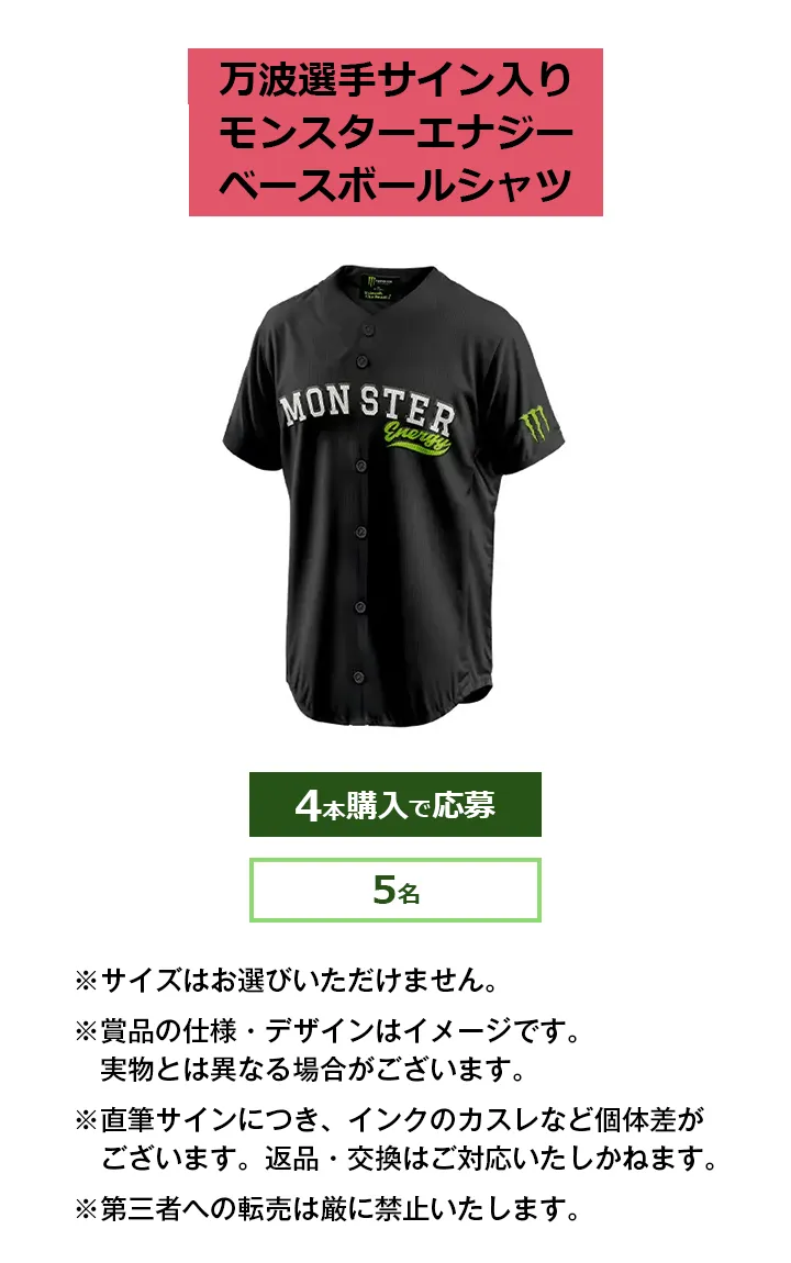 ・万波選手サイン入りモンスターエナジー ベースボールシャツ 1枚:4本購入で応募 / 5名当選
