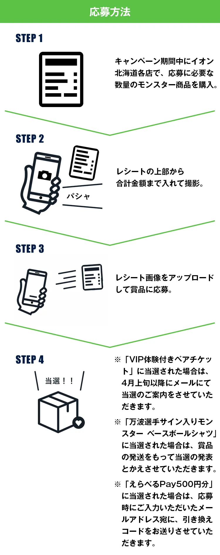 ※日本標準時応募規約モンスターエナジージャパン合同会社(以下、「モンスターエナジー」といいます。)が運営する「モンスターエナジー&北海道日本ハムファイターズ VIP体験を手に入れろ」キャンペーン(以下、「本キャンペーン」といいます。)は、本応募規約の下、厳正に行われるものです。本キャンペーンをご利用頂くにあたっては、以下の応募規約をよくお読み頂き、本応募規約にご同意頂けない場合にはご応募をお控え下さい。応募者は、応募と同時に、本応募規約に同意したものとみなされます。