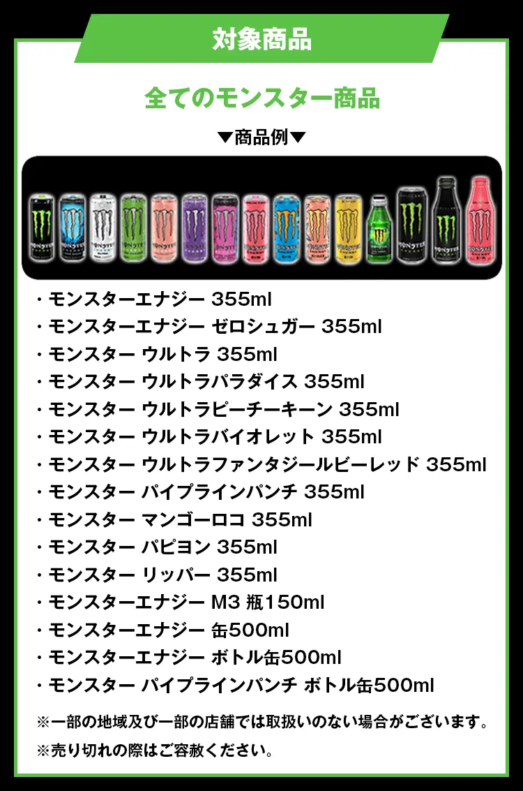 対象商品:モンスターエナジー、モンスターエナジー ゼロシュガー、モンスター ウルトラ、モンスター ウルトラパラダイス、モンスター ウルトラピーチーキーン、モンスター ウルトラバイオレット、モンスター ウルトラファンタジールビーレッド、モンスター パイプラインパンチ、モンスター マンゴーロコ、モンスター パピヨン、モンスター リッパー、モンスターエナジー M3、モンスターエナジー 缶500ml、モンスターエナジー ボトル缶500ml、モンスター パイプラインパンチ ボトル缶500ml