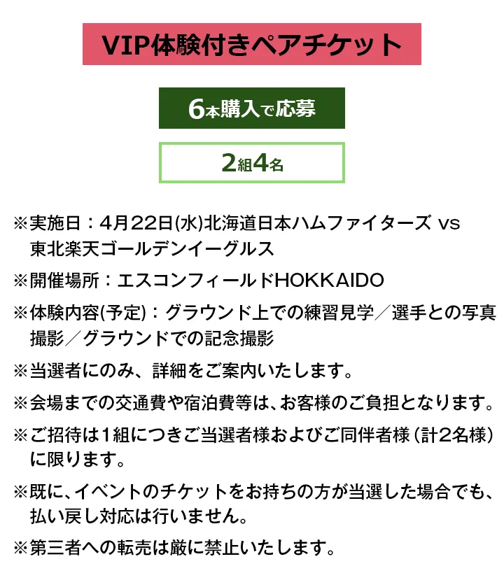 景品の応募条件/当選者数・VIP体験付きペアチケット 2名分:6本購入で応募 / 2名当選